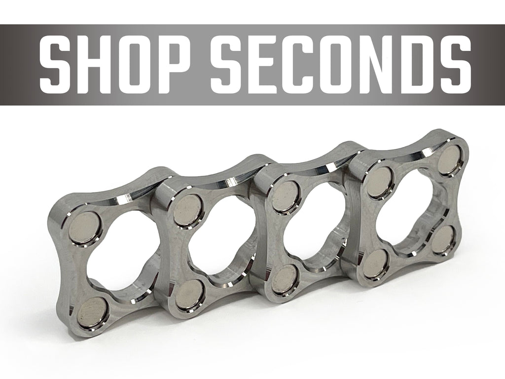 Each slider piece is CNC machined from a single piece of stainless steel. The magnet bores are held to very tight tolerances to provide a secure press fit without any adhesives. The final magnet depth is set to .65mm from the top surface using purpose-built jigs and fixtures.